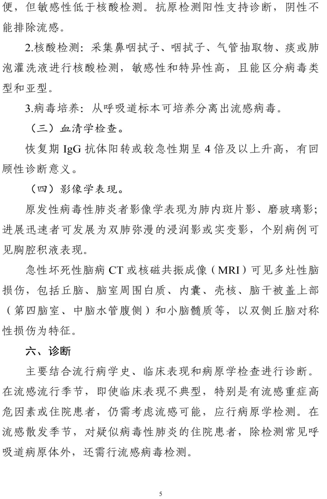 此版诊疗方案明确了流感病原学检测主流方法学为抗原,核酸检测,完善了流感发病机制、病理以及临床表现,增加了临床轻型和中型分型的明确表述,给出重型和危重型标准,细化了抗病毒治疗原则以及重症病例支持治疗措施。